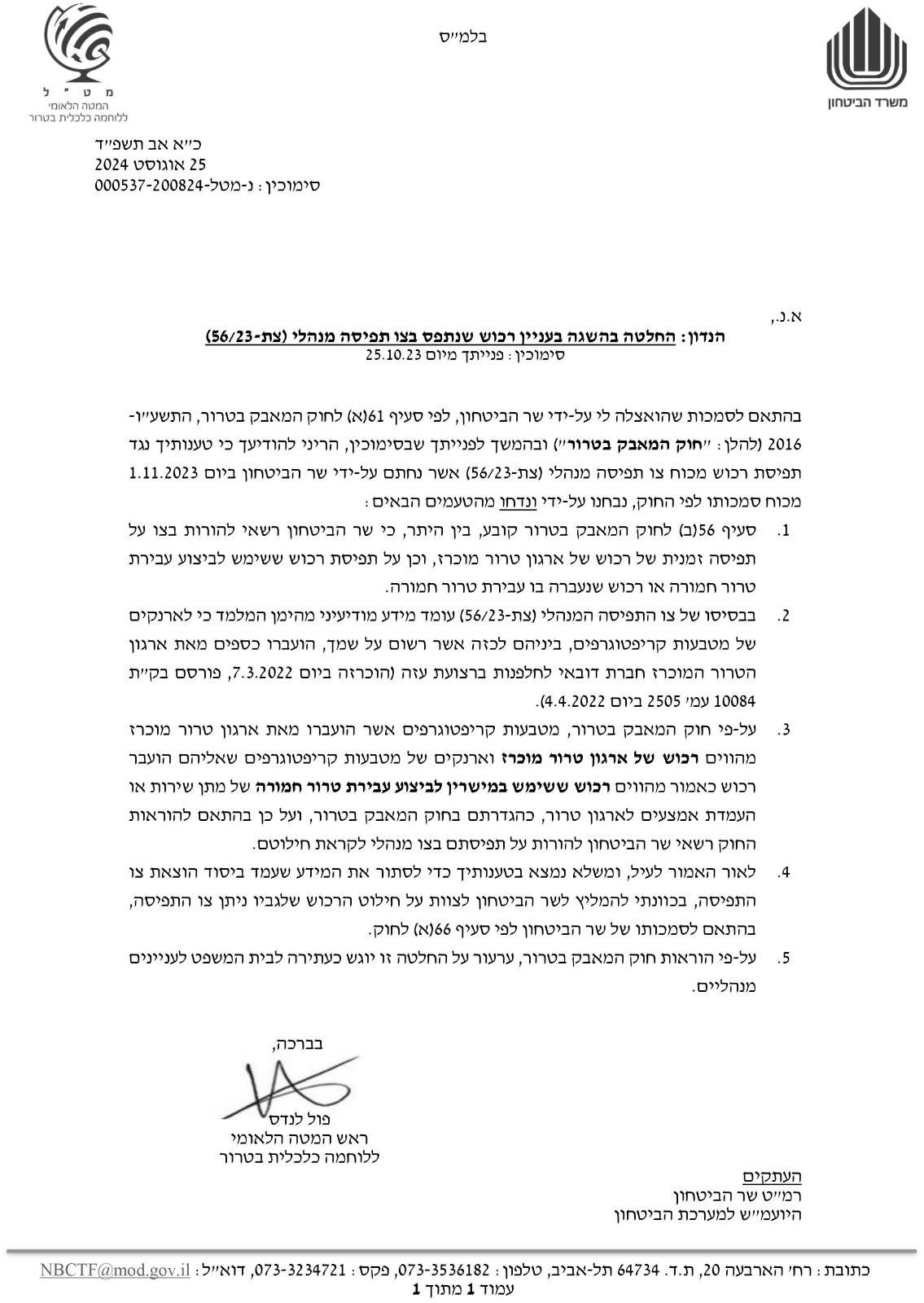 The confiscation reportedly follows a letter written in Hebrew and signed in November last year by Paul Landes, head of Israel National Bureau for Counter-Terror Financing. The letter states that under antiterrorism rules, Israel’s Ministry of Defense has the authority to temporarily seize assets, including crypto, from organizations that have been labeled as terrorist entities.